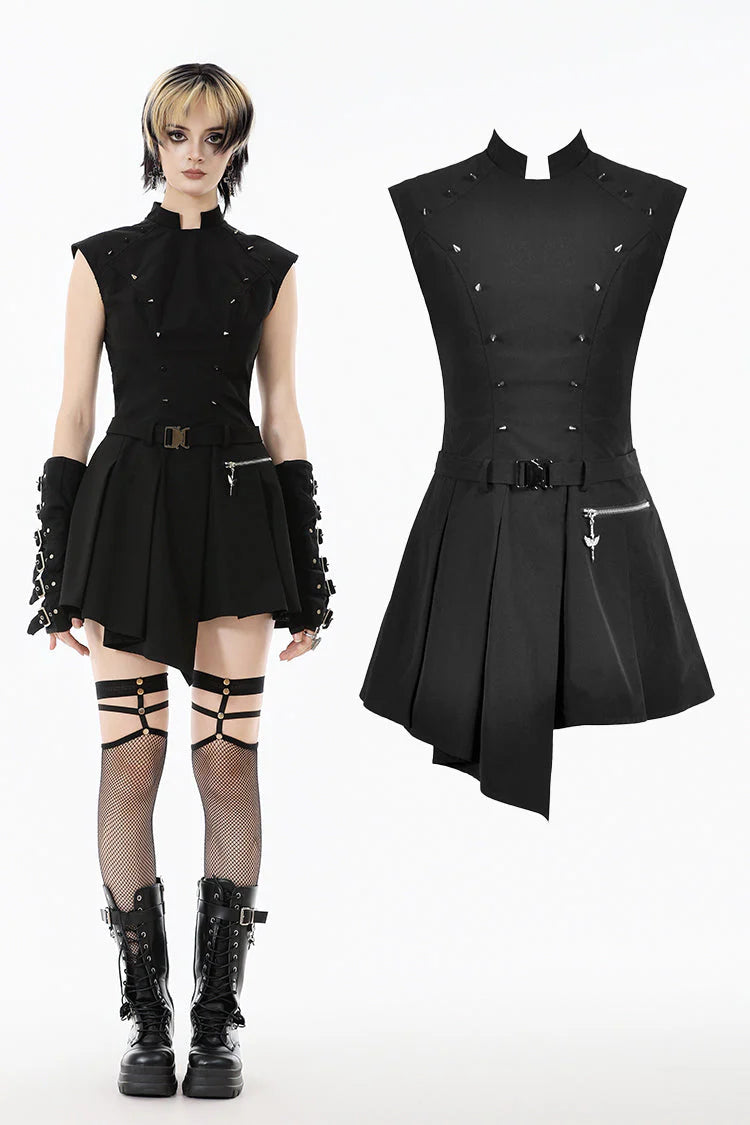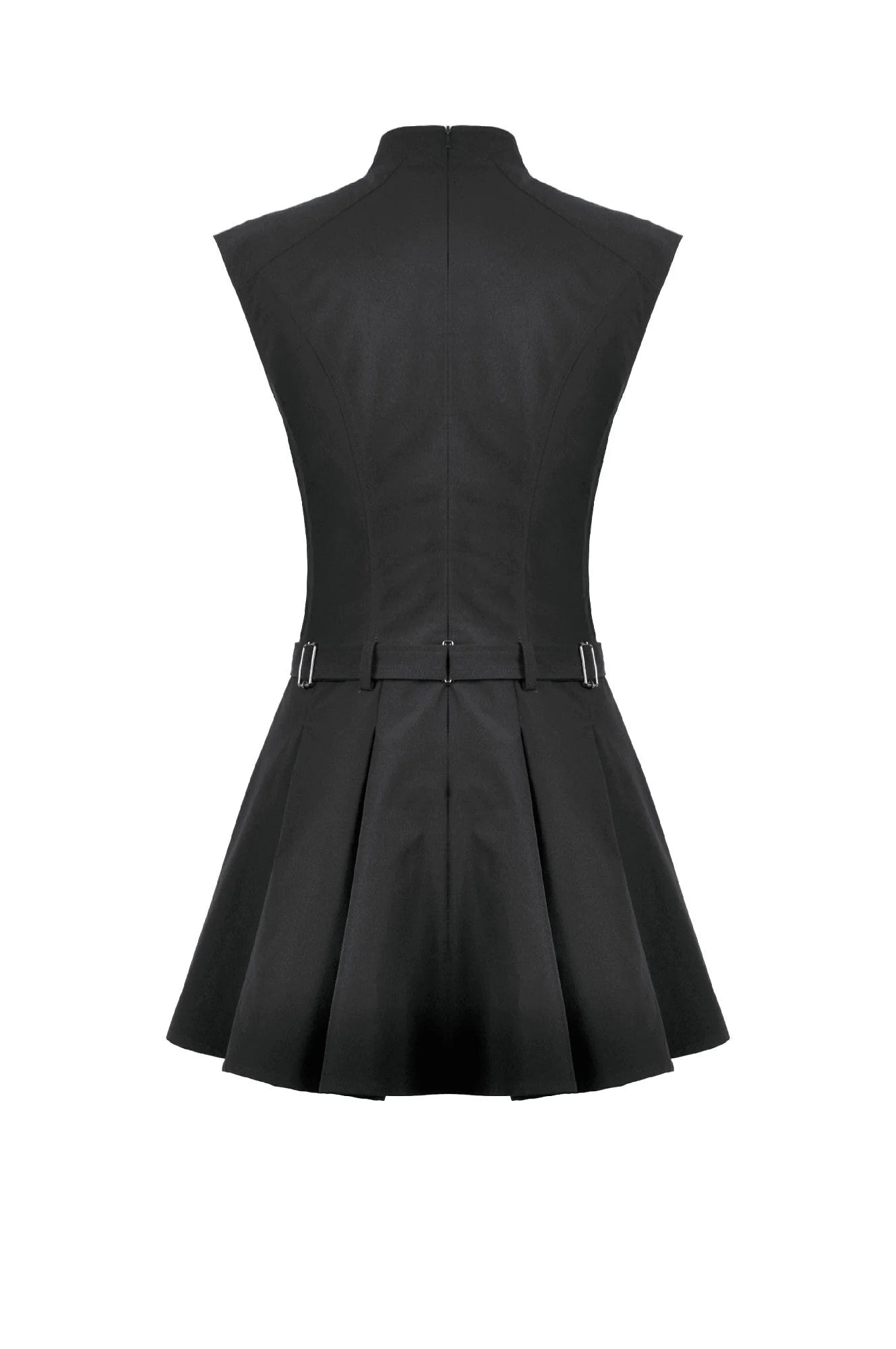 Deze punk-geïnspireerde jurk heeft een staande kraag met een open voorkant, geaccentueerd door een holle sterhanger voor een rebelse touch. De naden van de prinses zijn versierd met metalen stijlen, wat de scherpe uitstraling benadrukt. Een tactische gespriem sluit de taille aan voor een verstelbare pasvorm. De asymmetrische geplooide rok zorgt voor dynamische beweging, terwijl een zijrits met metalen bedeling extra detail biedt. Gedurfd en stijlvol, dit stuk combineert street punk-esthetiek met moderne flair.