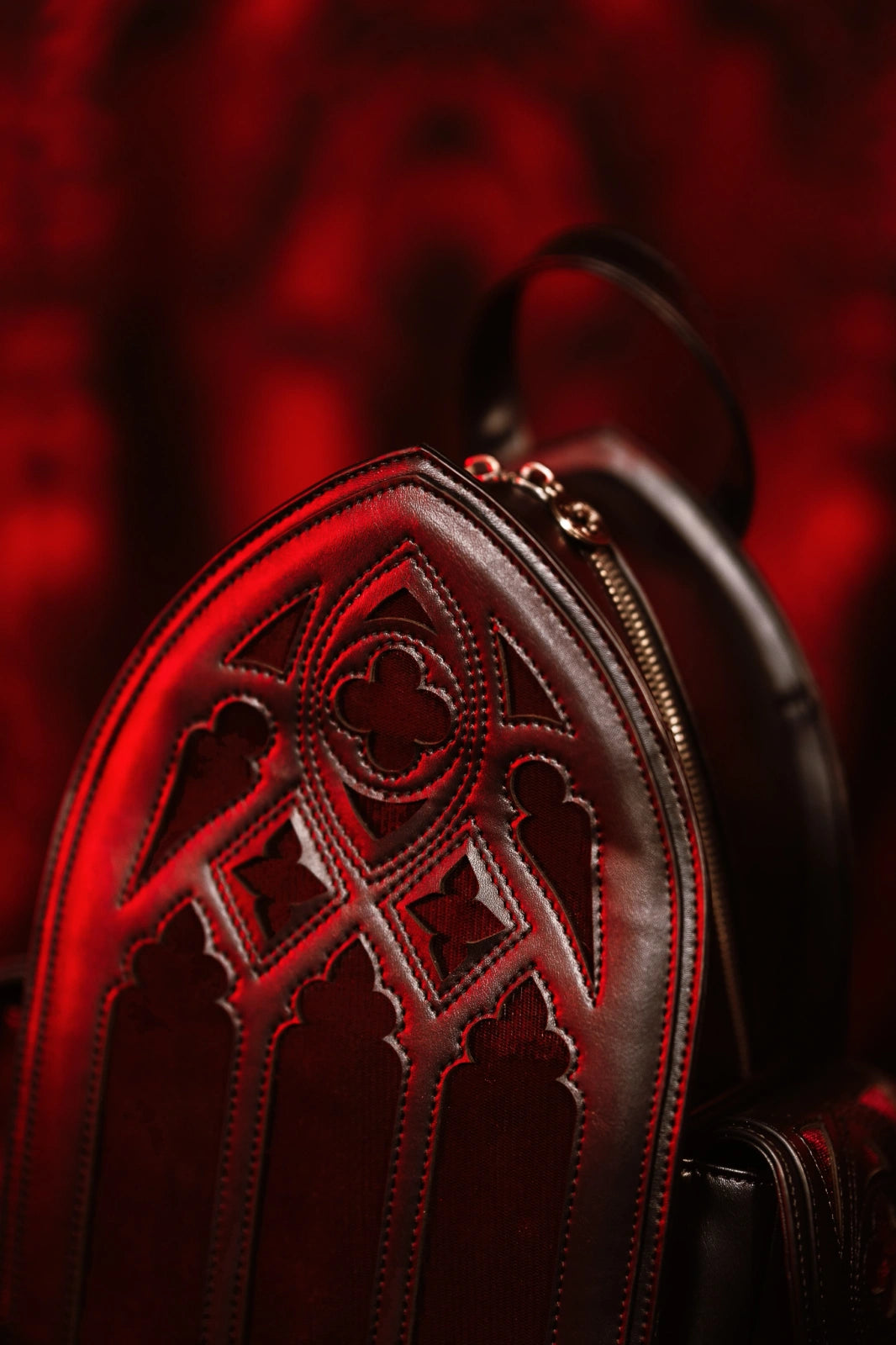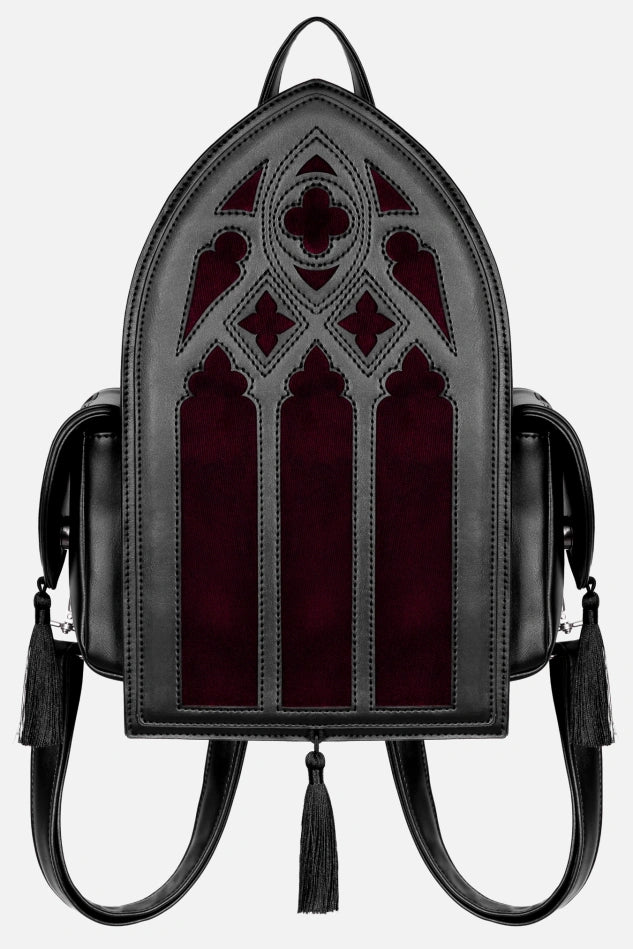 🩸 RUBRUM LUX is de essentie van donkere romantiek en gotische elegantie. Deze door vampiers geïnspireerde rugzak, gevormd als een boogvormige kathedraalraam met ingewikkeld traceringwerk, combineert glanzend zwart met diep bordeauxrood fluweel om een nobel, mysterieus contrast te creëren.