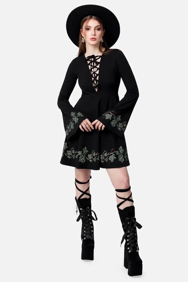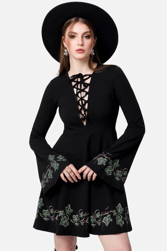 🌿✨ TANGLED VINES MINI JURK – Witchy botanische jurk met klimop print en uitlopende mouwen 🖤