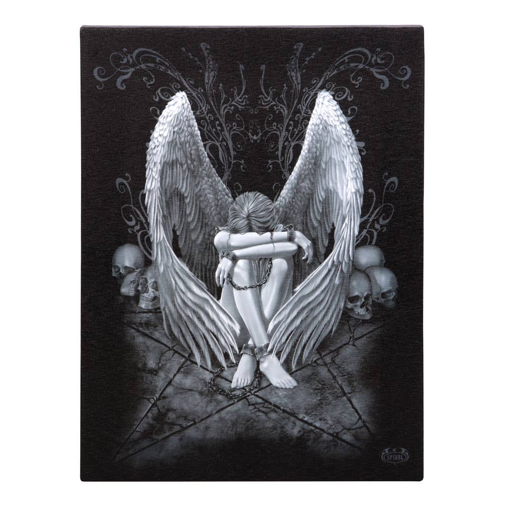Deze donkere en stoere canvasplaat is voorzien van gelicentieerde kunstwerken van Spiral Direct. 'Enslaved Angel' toont een geketende engel die huilt om schedels van de doden en zal elk gotisch decor verheffen. 19x25 cm.