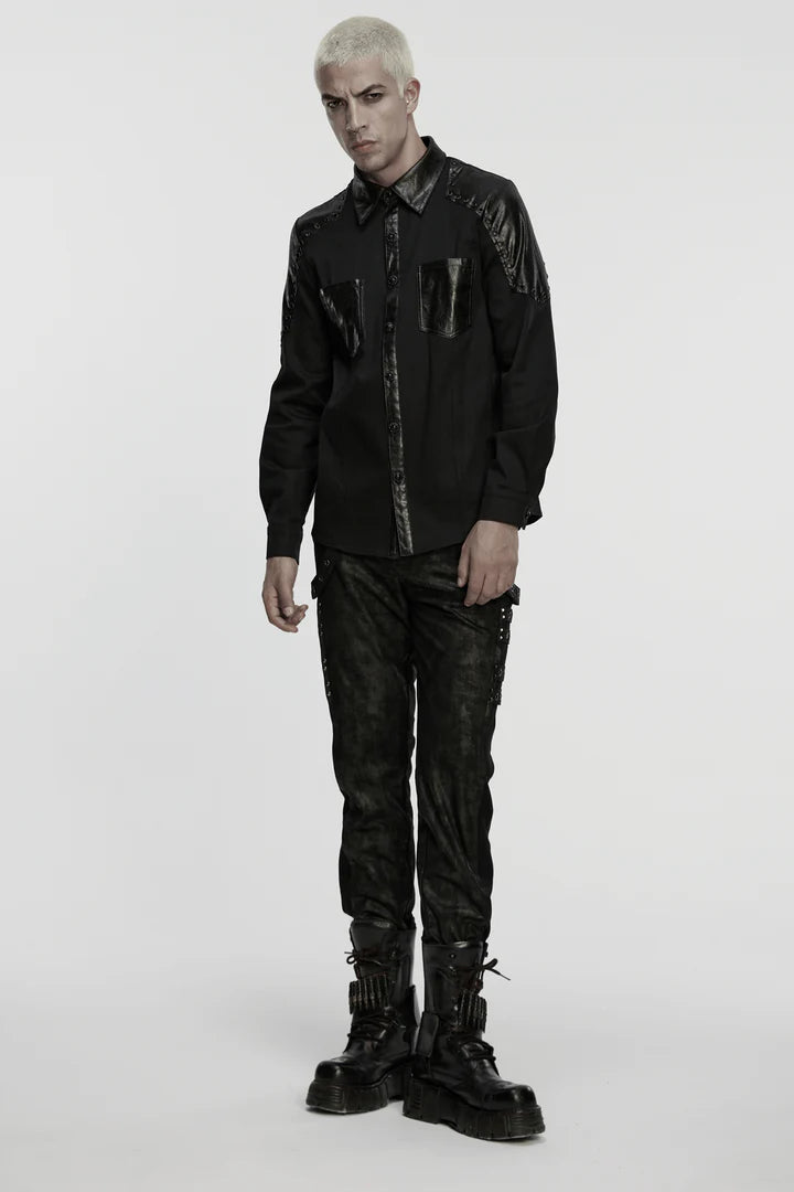 Gemaakt van elastische twill-geweven stof en een gerubberd leerachtig materiaal, zorgt dit punkshirt voor een strakke, gestructureerde uitstraling. Het gesegmenteerde schouderpantserontwerp is omlijnd met zwarte oogjes voor extra scherpte. De nette silhouet en strakke vorm versterken de gedurfde esthetiek, waardoor het een opvallend stuk is voor alternatieve en donkere modestijl.