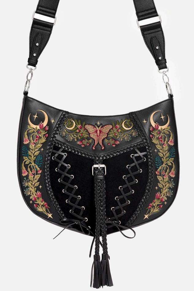Deze geborduurde tas is zacht betoverend en versierd met manen, motten en wilde plantaardige ingrediënten in een prachtig kleurenpalet. Veterdetails, vlechten en kwastjes geven het een gelaagd, handgemaakt gevoel.
