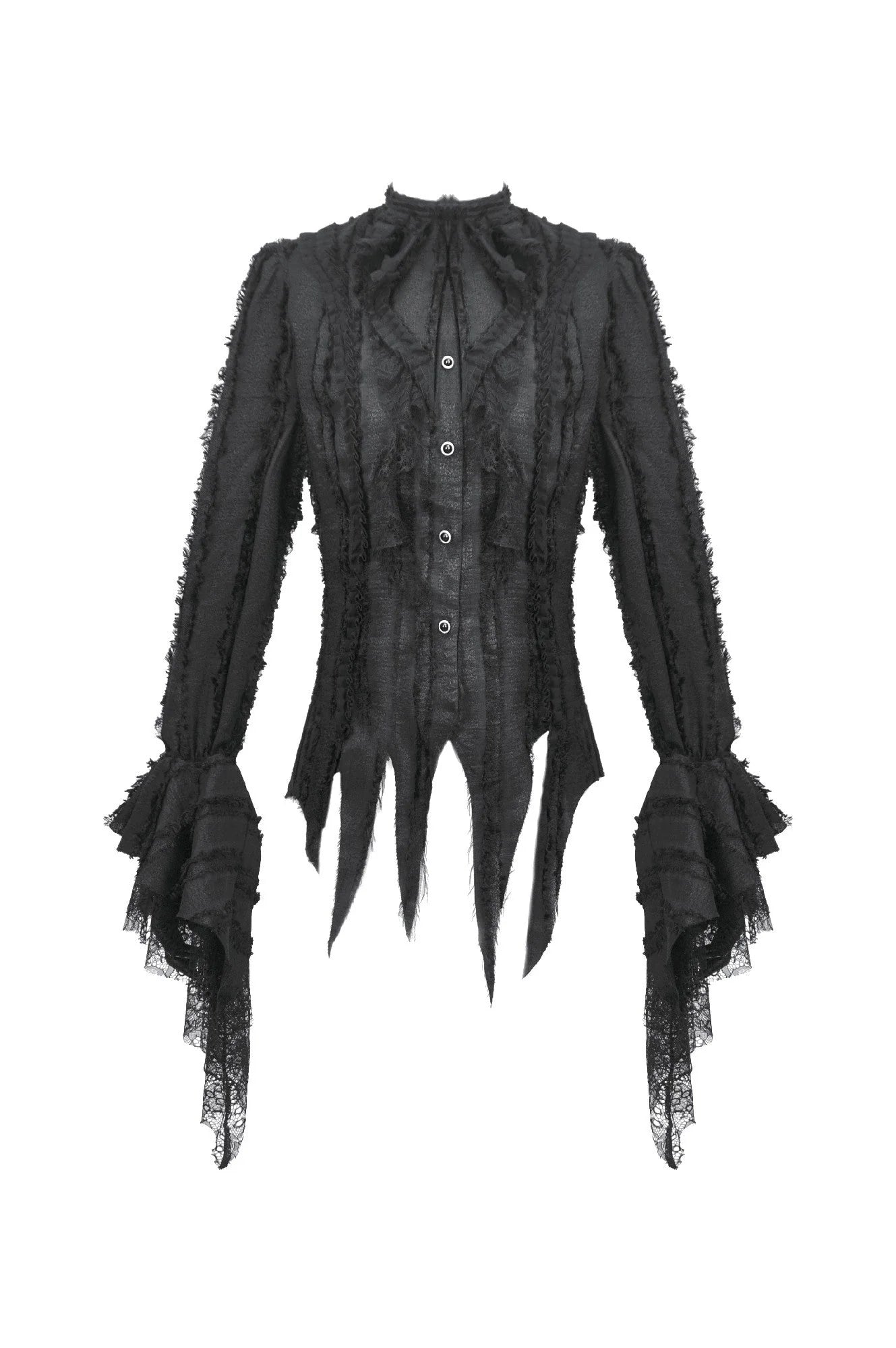 Gelaagde kant valt in spookachtige golven uit de mouwen, echoën van fantoomledematen die dansen in het maanlicht. Een afneembaar kant halsversiering voegt koninklijke drama toe of kan worden verwijderd voor een rauwe, ongetemde uitstraling. Perfect om onder korsetten te dragen, of alleen gedragen als een op zichzelf staande statement, belichaamt dit stuk de fragiele schoonheid van verval—evenveel spookachtig als majestueus.