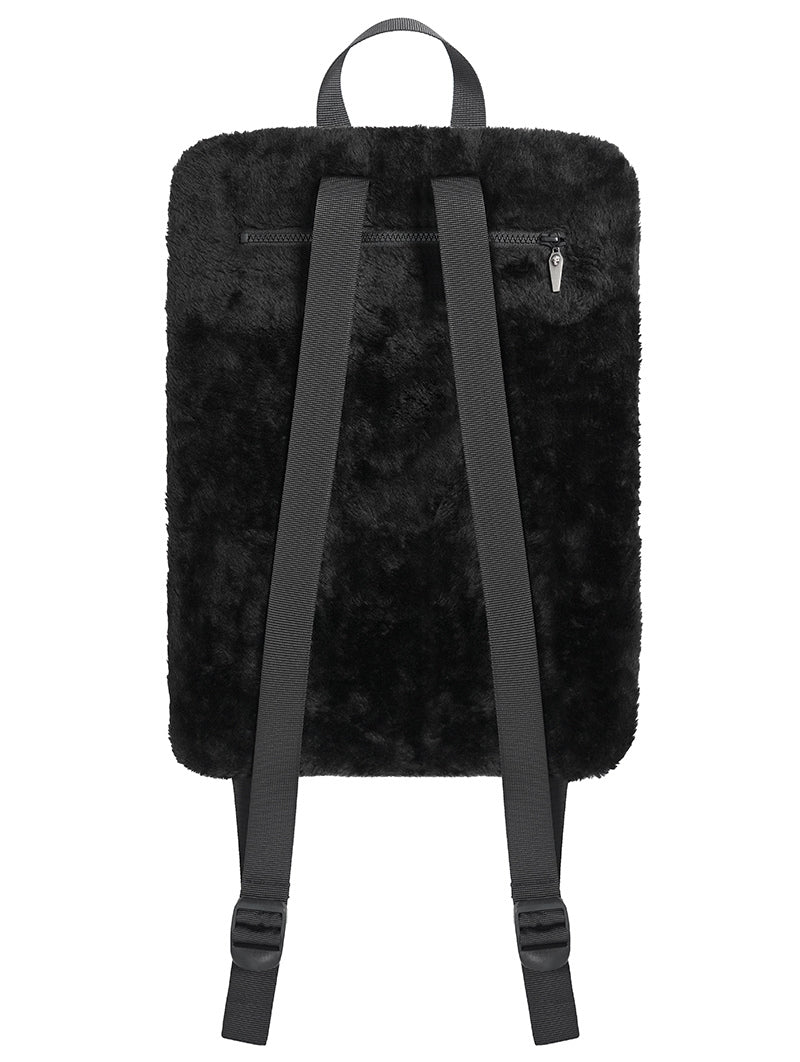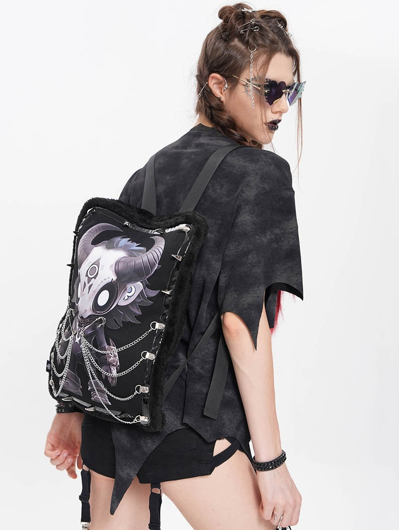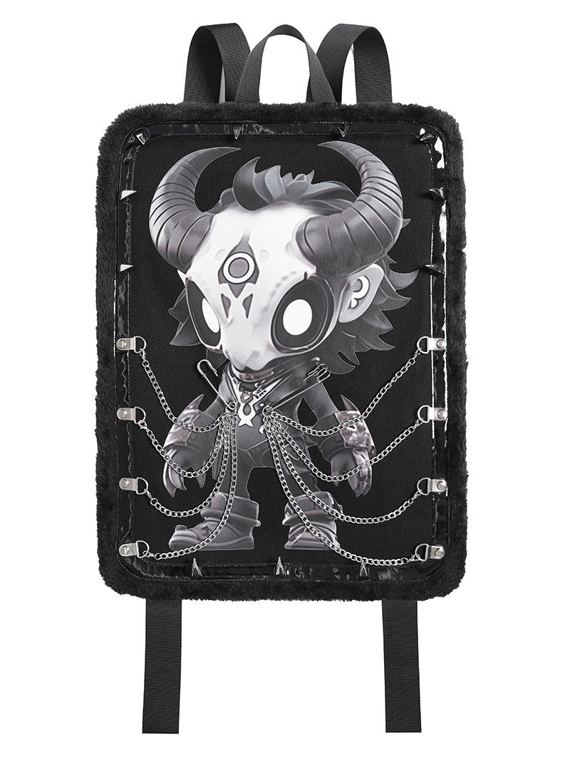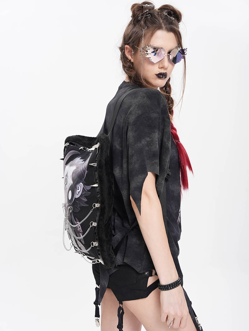 Omarm een donkere esthetiek met deze opvallende rugzak met nepbontconstructie en gedurfde grafische details. De compacte silhouet toont een bedrukt karakterontwerp, aangevuld met spiked hardware-accenten en glanzende veganistische lederen afwerking. Functionele elementen zijn onder andere verstelbare schouderbanden, een achterste ritszak en een decoratief kettingdetail. Gemaakt van een mix van polyester, katoen en synthetisch leer voor duurzaamheid en textuurcontrast.